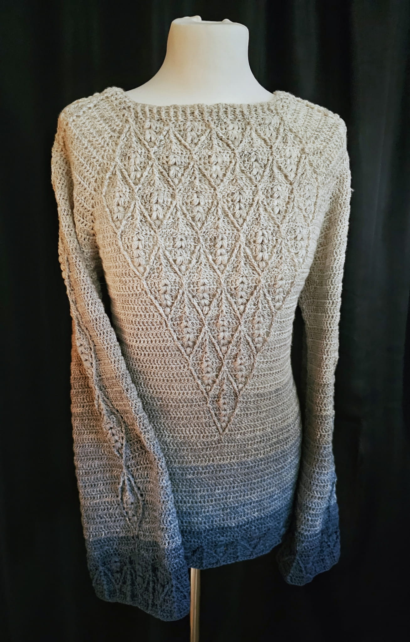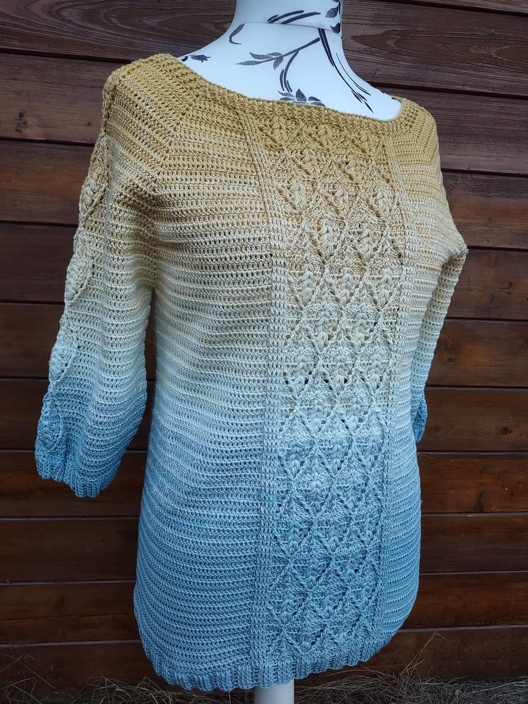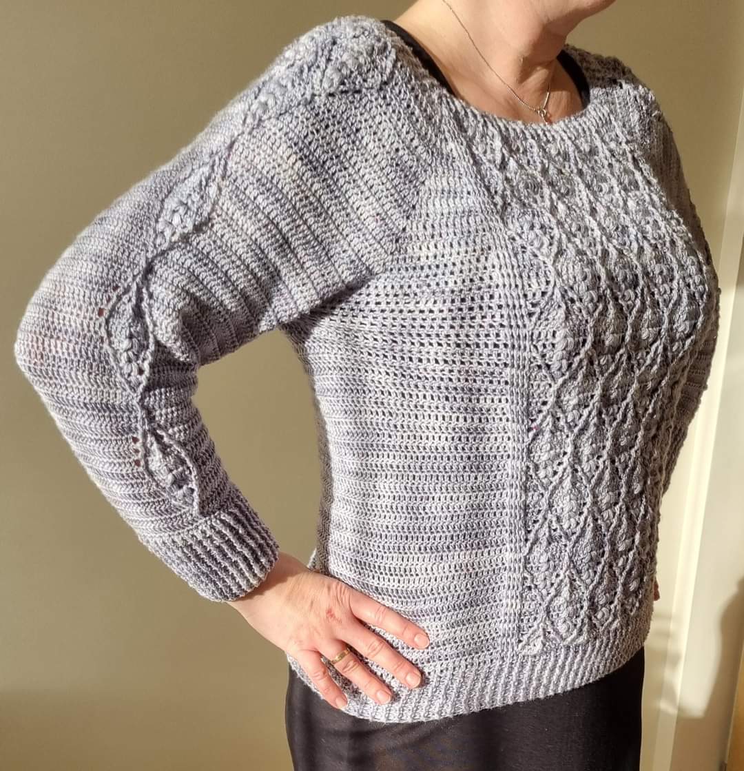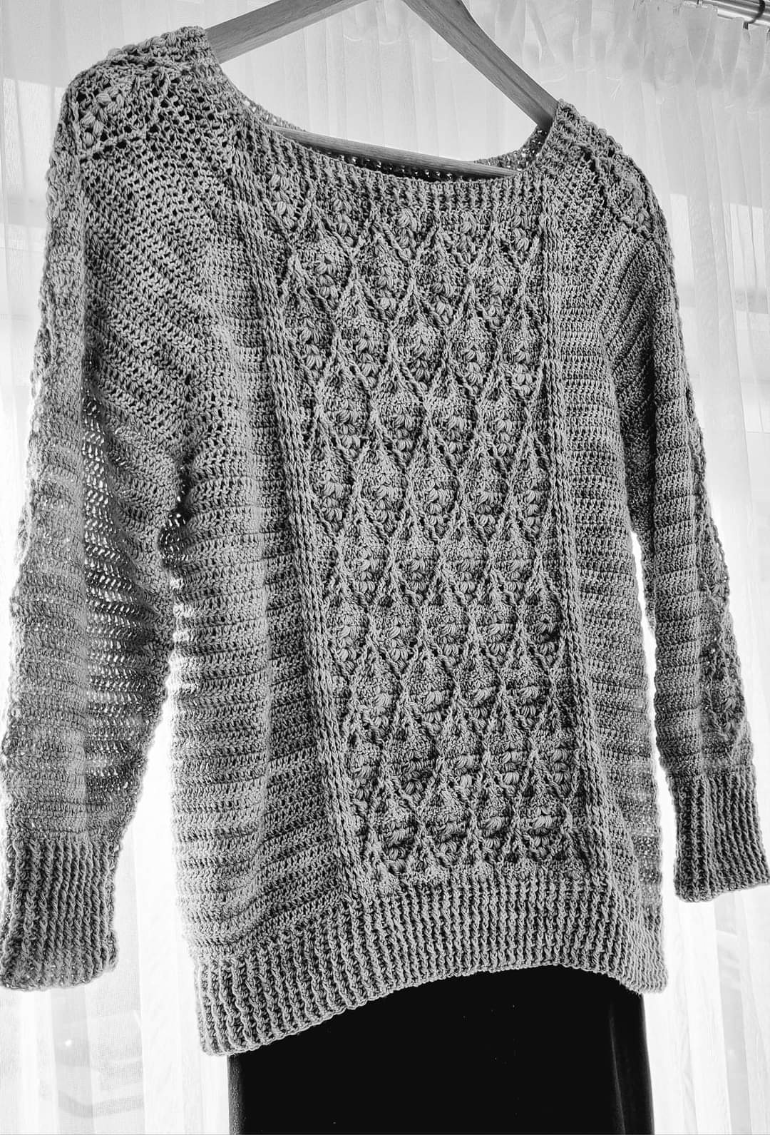 Sweterek możesz wykonać w kilku wersjach - z motywem w kształcie diamentu lub z prostym motywem na przodzie swetra. Dół i rękawy możesz wykończyć motywem ozdobnym, a nawet zrobić rozszerzane rękawy! - wybór należy do Ciebie!